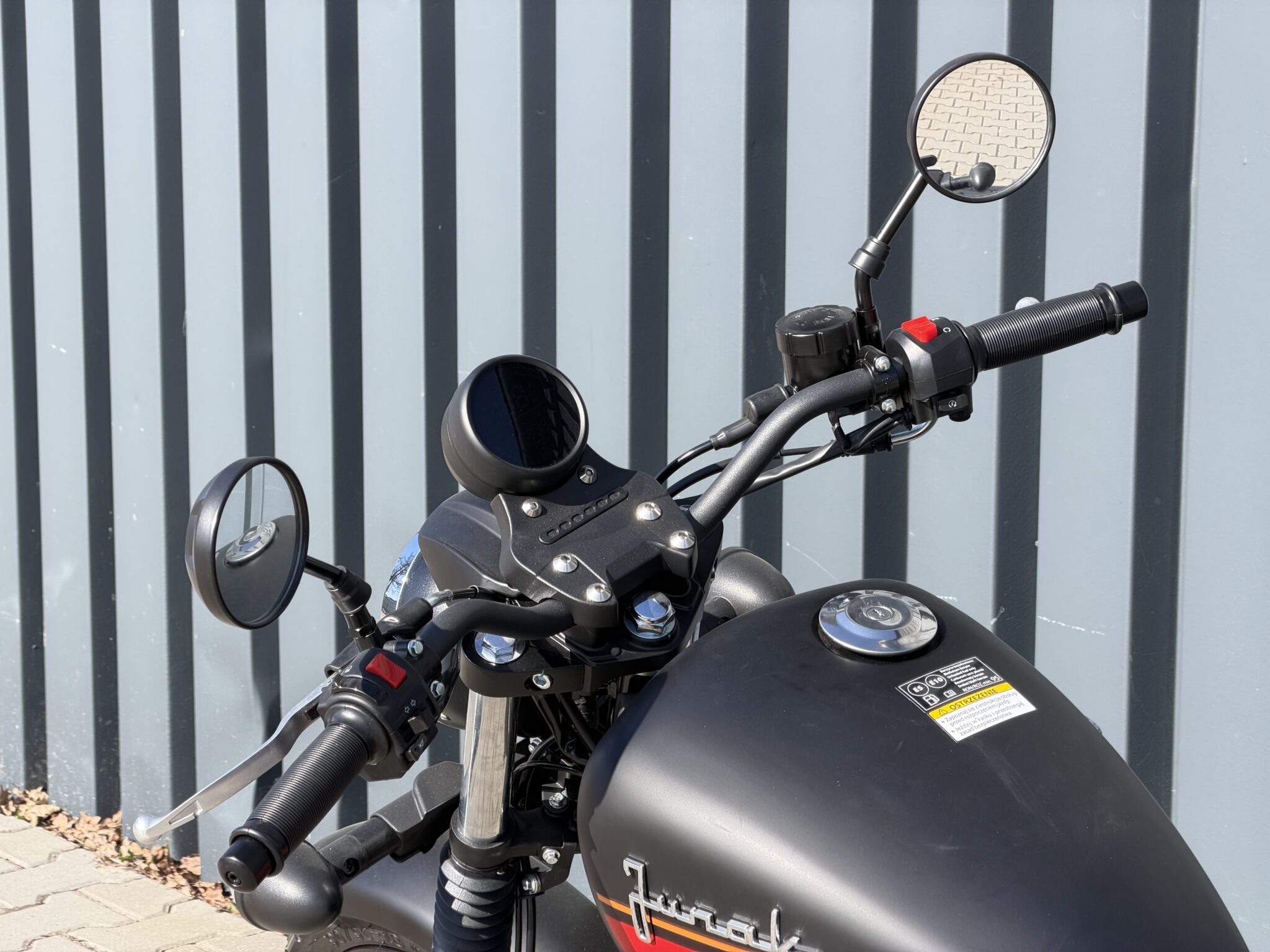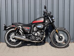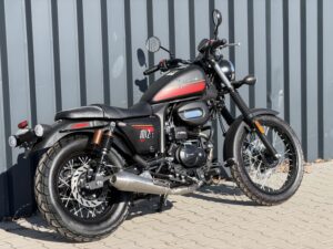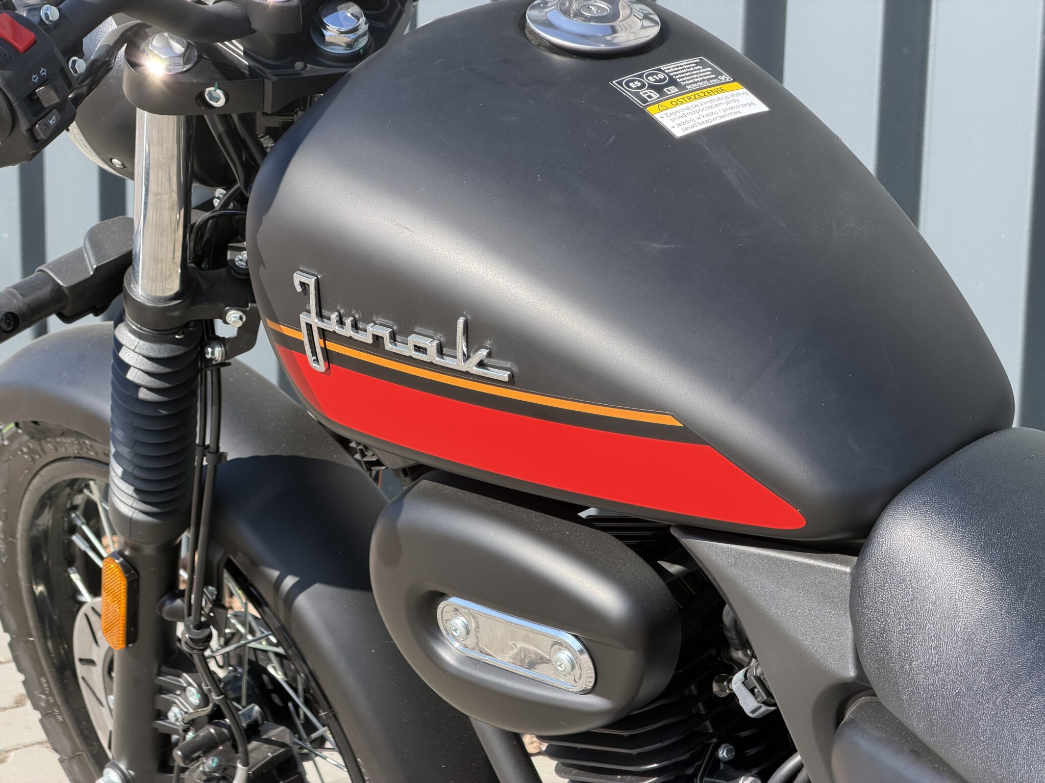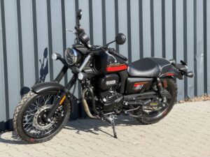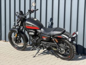 • czarno-bordowym (DOSTĘPNY W SALONIE POLKOM) – z szerokim bordowym pasem biegnącym w dolnej części zbiornika, zaakcentowanym lekką pomarańczową linią. To malowanie nadaje motocyklowi bardziej zdecydowanego charakteru. Matowe wykończenie sprawia, że całość wygląda ciężej, bardziej dostojnie i surowo – to wariant, który podkreśla zdecydowany styl kierowcy.