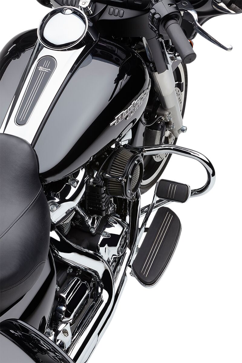 Wykonane z solidnej, grubościennej stali z przyspawanymi kołnierzami o wysokiej wytrzymałości, oferują trwałość i stabilność. Odznaczają się wysoką jakością wykonania oraz estetycznym, atrakcyjnym designem. Zapewniają dużo miejsca na stopy wokół płyty podłogowej i stanowią wygodną platformę do ich rozprostowania i oparcia podczas jazdy. Pałąki pełnią funkcję wyłącznie estetyczną i mogą zapewnić jedynie minimalną ochronę motocykla. Nie są przeznaczone do ochrony ciała w żadnych warunkach. Wyprodukowane w USA.