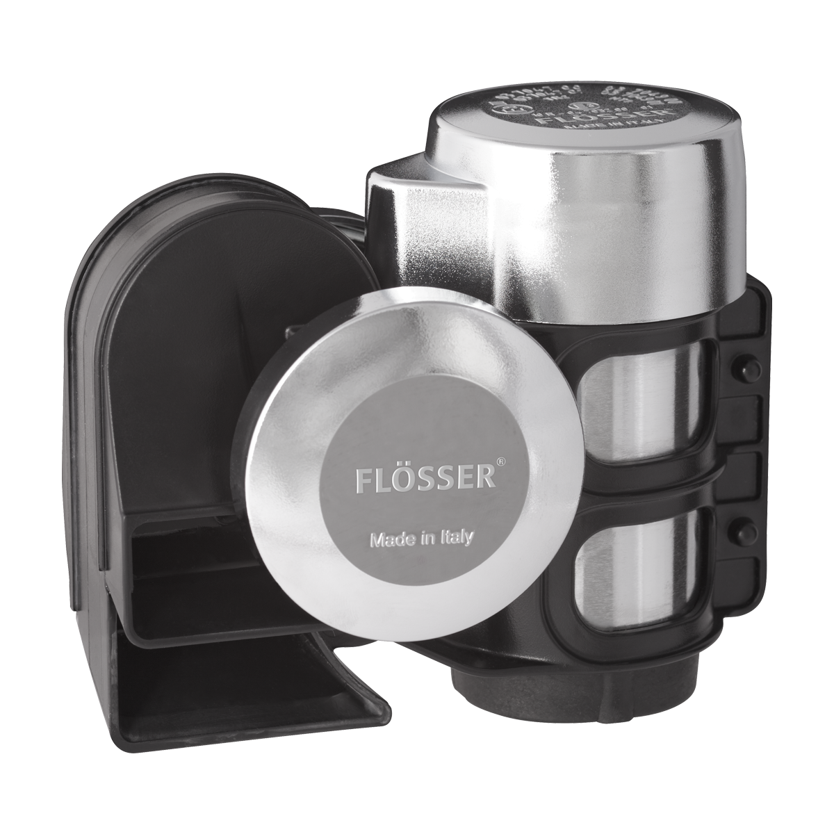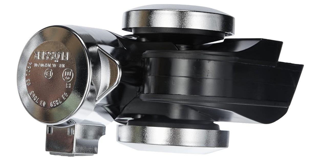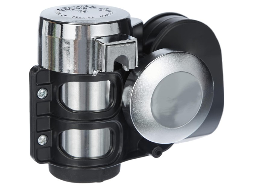 Klakson elektryczno pneumatyczny z chromowanym wykończeniem.
