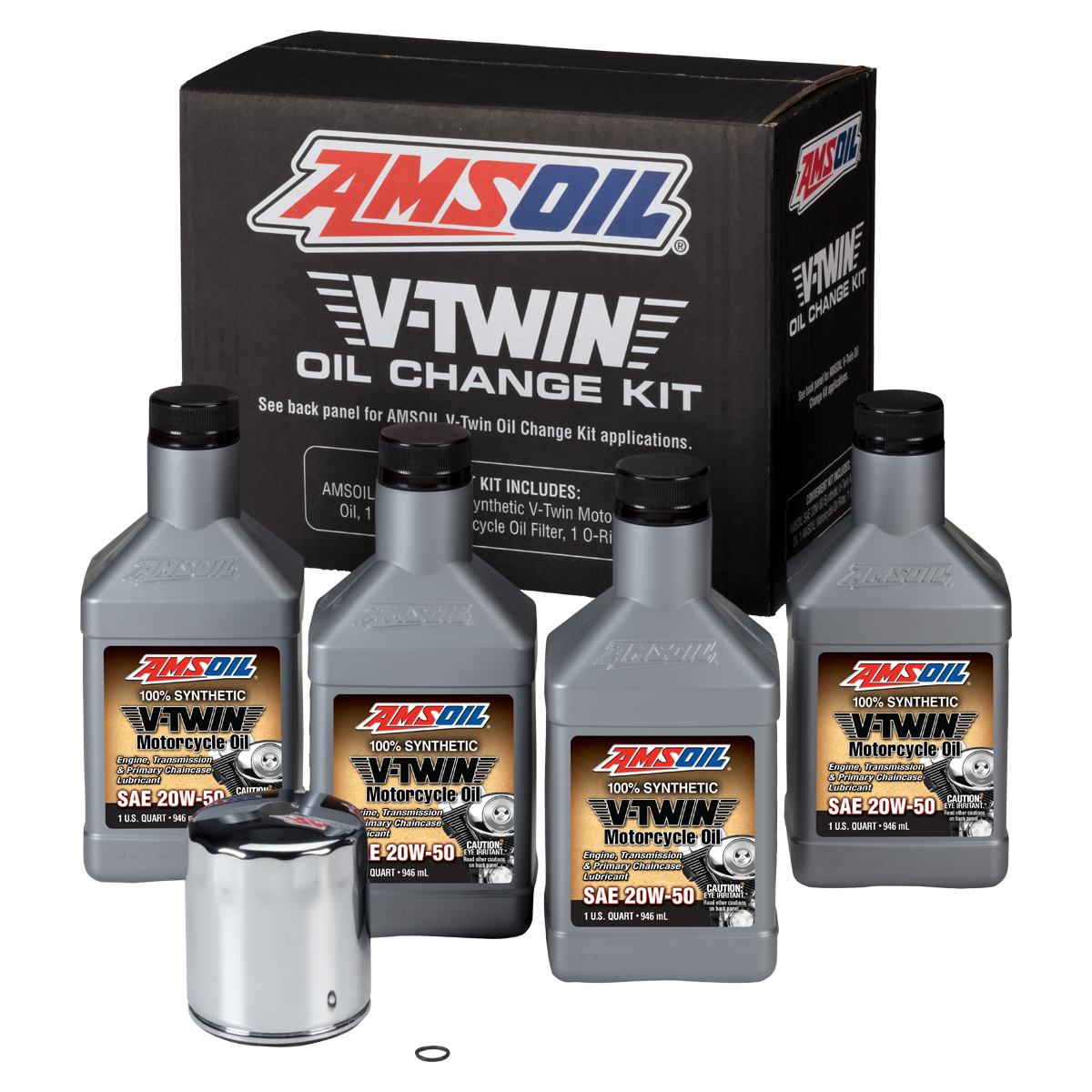 – 4 sztuki syntetycznego oleju motocyklowego AMSOIL 20W-50 do motocykli V-Twin (MCV) w opakowaniach po 946ml.